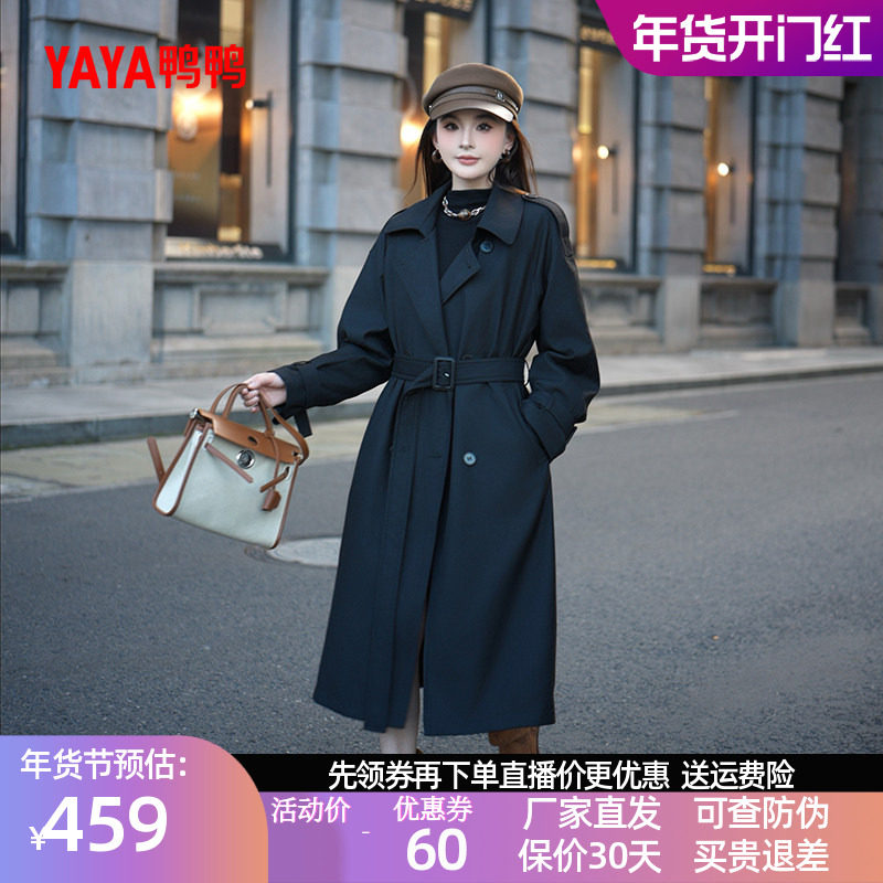 鸭鸭羽绒服2025年冬装新款女士风衣中长款收腰修身翻领休闲外套