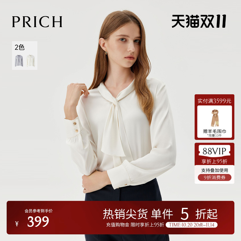PRICH时尚简约优雅飘带V领长袖衬衫2025冬季新款气质光泽感衬衣女