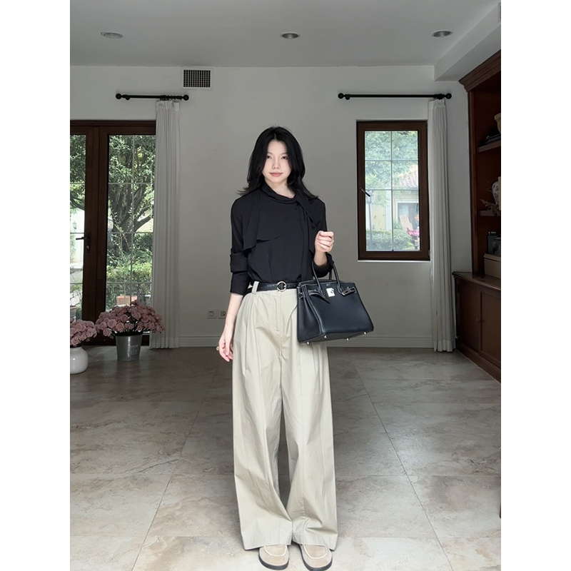 郭九九呢 设计感飘带荷叶边长袖衬衫女秋季上衣全棉直筒阔腿长裤