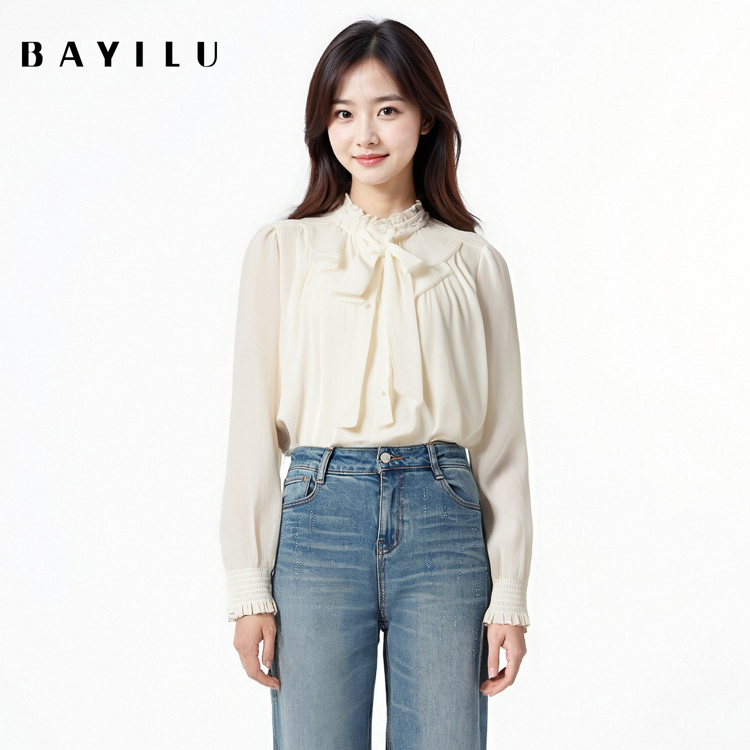 【莱赛尔】Eland衣恋衬衫女时尚荷叶领长袖飘带上衣2025冬季新款