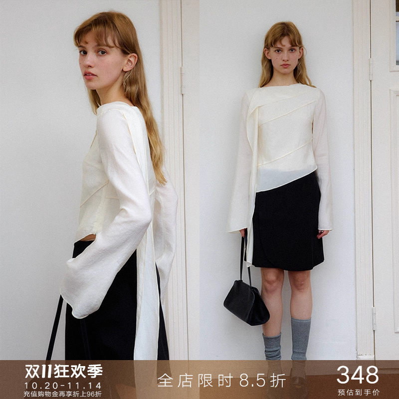 NEVA HU 高级感缎面斜肩长袖衬衫女露肩设计感气质飘带短款上衣
