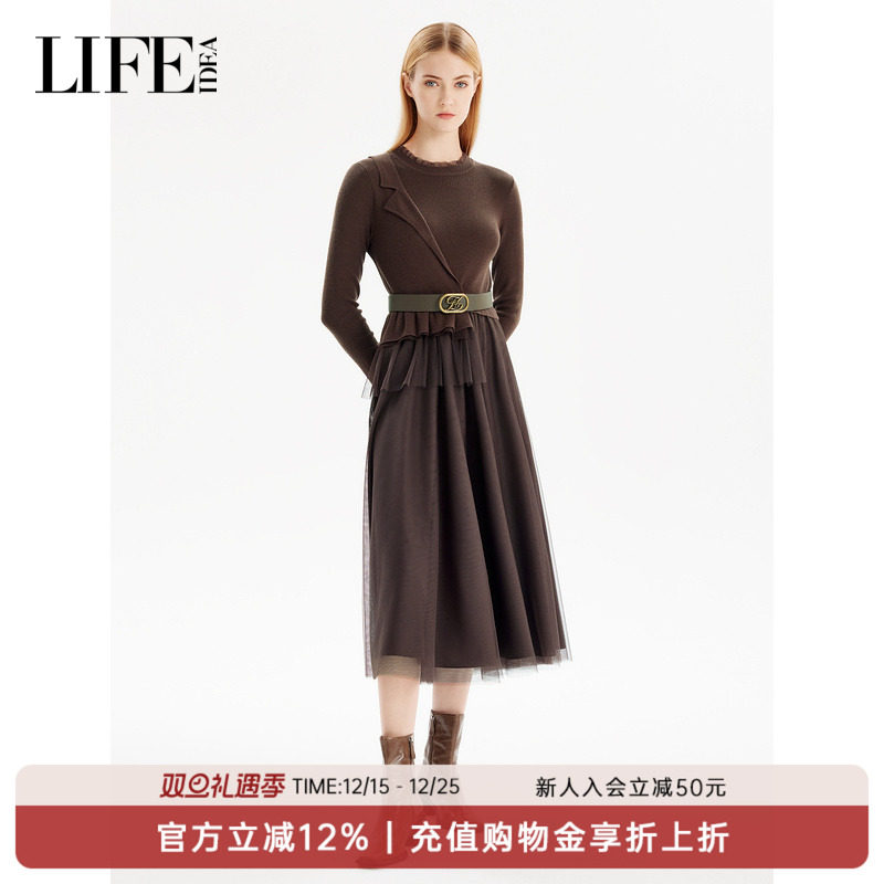 LIFE·IDEA羊毛针织连衣裙女拼接不对称网纱新品打底中长裙子