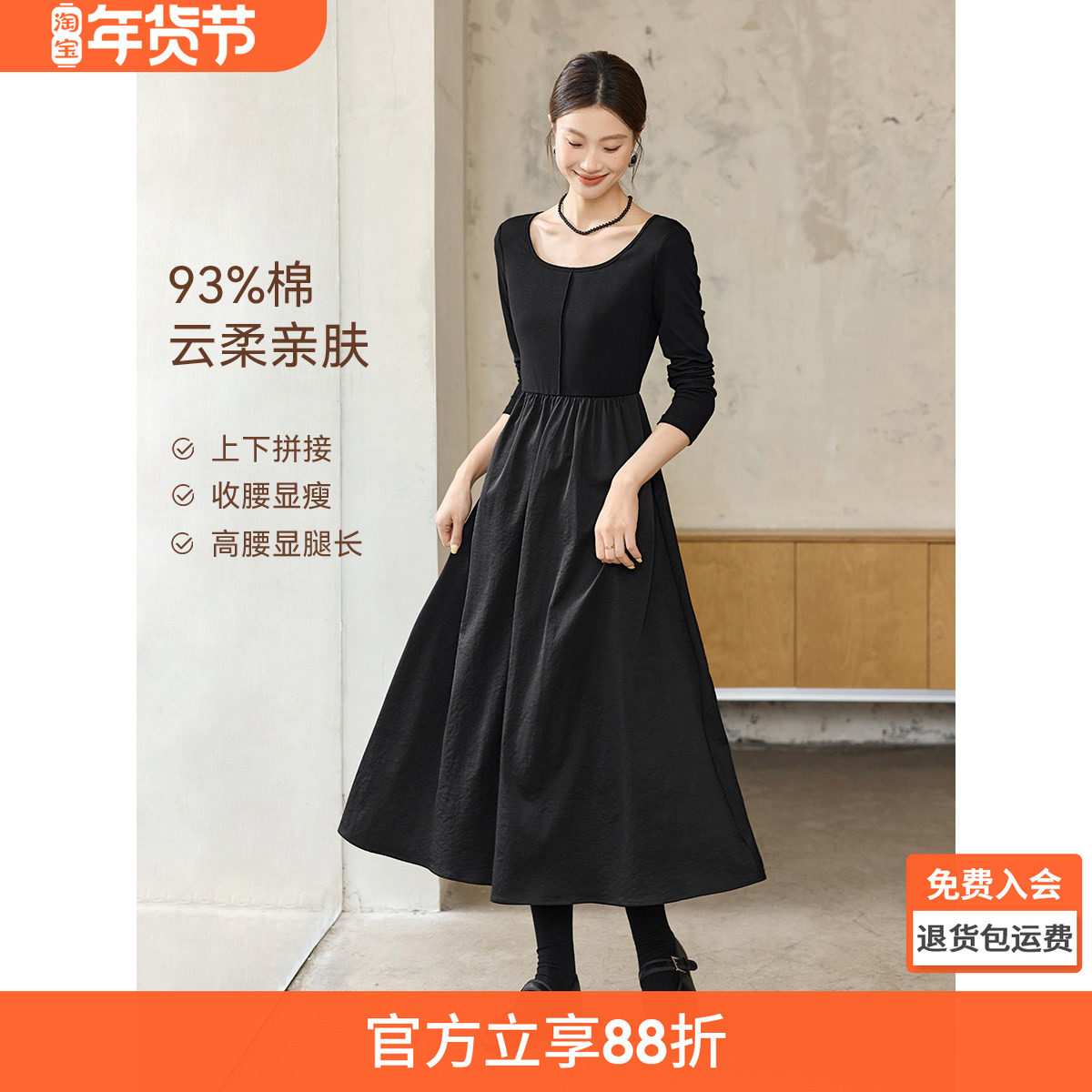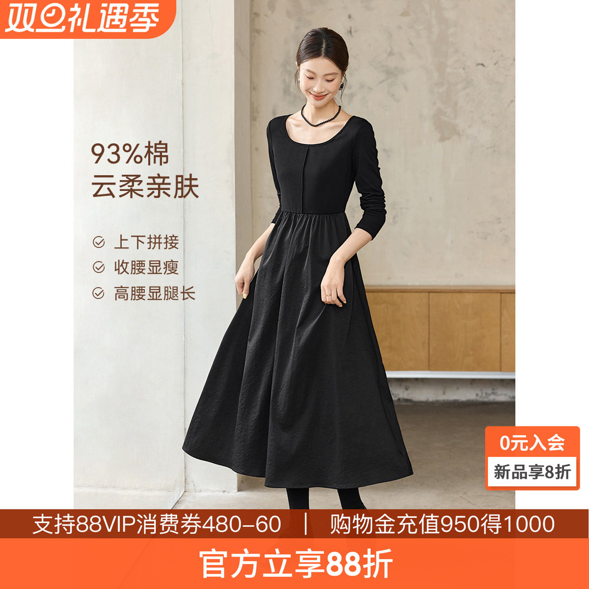 沫晗依美老钱显瘦连衣裙2025秋季简约气质打底拼接弹力收腰长裙女
