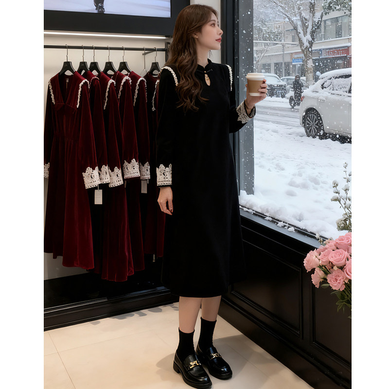 2025冬款新中式复古国风连衣裙花边拼接设计气质打底裙子8133