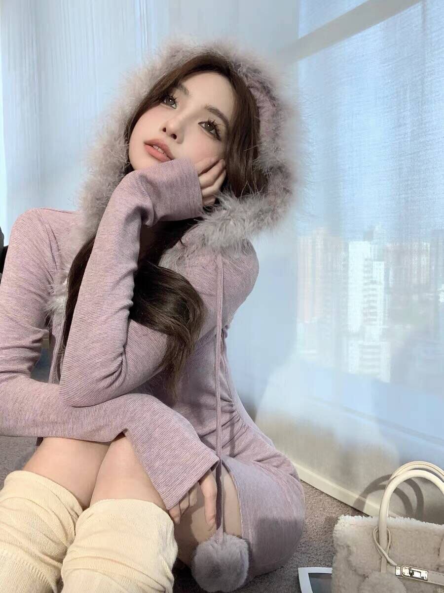 纯欲风毛毛领拼接连帽针织连衣裙秋冬新款法式辣妹打底包臀短裙女