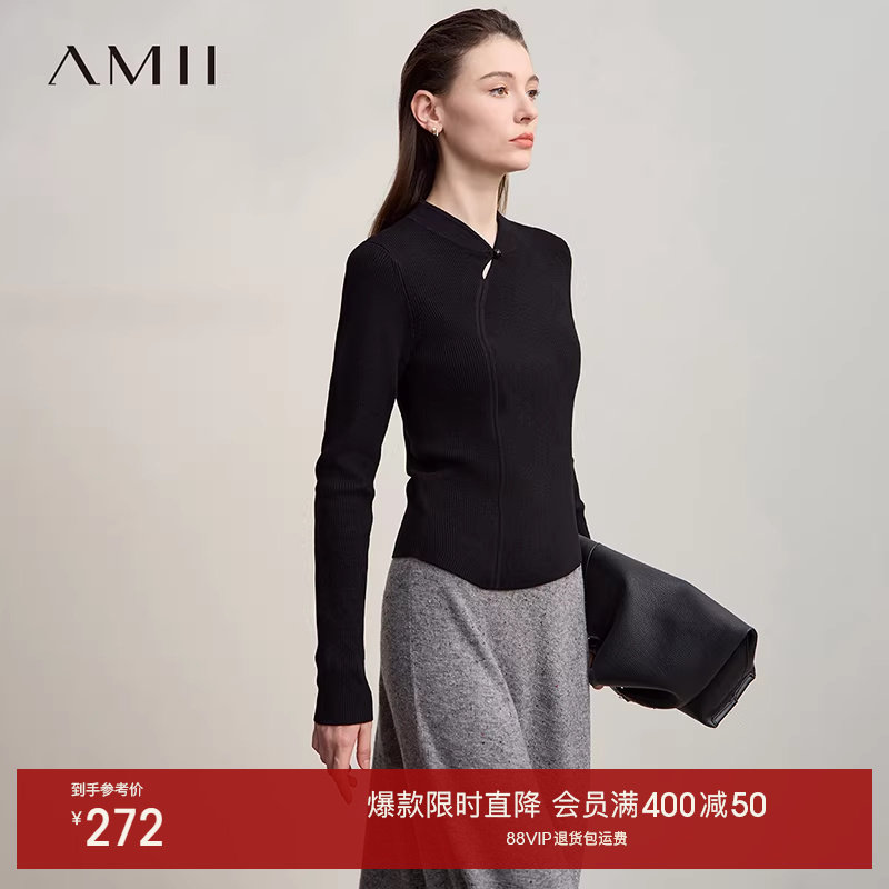 Amii2025秋新款极简新中式国风旗袍领修身弹力套头合肩长袖毛衣