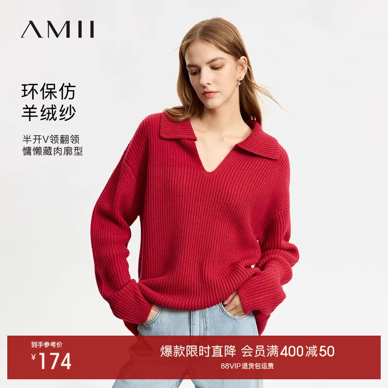 Amii2025冬新款翻领V领宽松落肩袖毛衣女法式舒适慵懒感套头上衣
