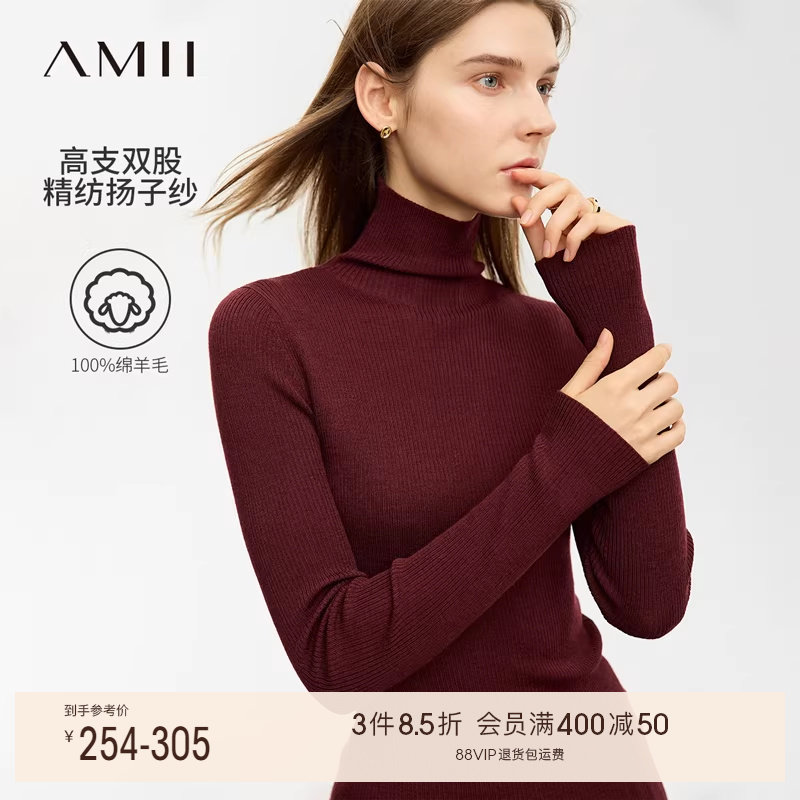 Amii2025冬新款通勤百搭高领无缝一体成型毛衣女抗菌羊毛衫上衣