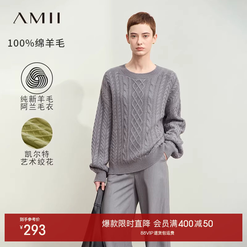 Amii春季新款圆领落肩袖纯新羊毛阿兰渔夫毛衣女绞花扭花上衣