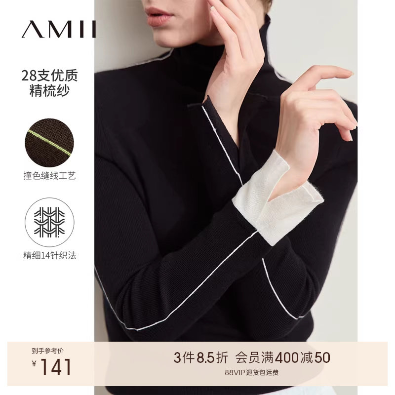 Amii2025秋新品半高领长袖毛衣女修身百搭显瘦上衣简约针织打底衫