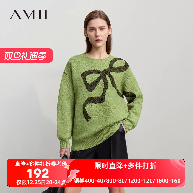 Amii2025冬新款休闲百搭加厚蓬松羊毛纱落肩蝴蝶结撞色提花毛衣