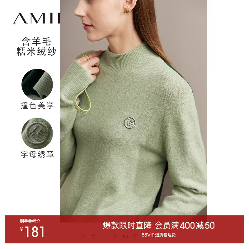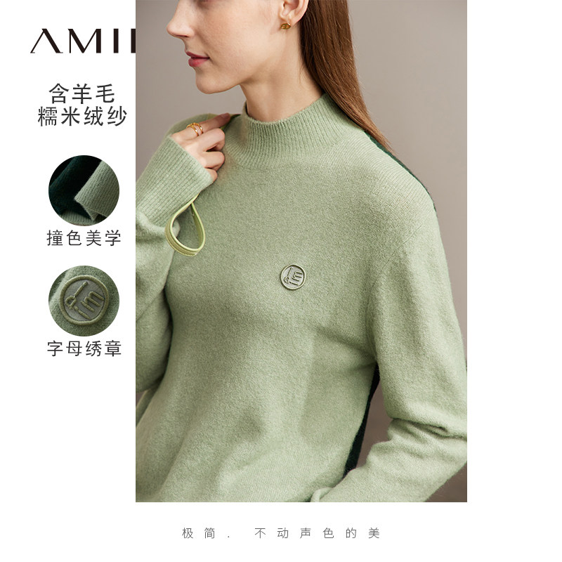 Amii2025冬新款通勤半高领落肩袖字母绣章宽松毛衣女撞色拼接上衣