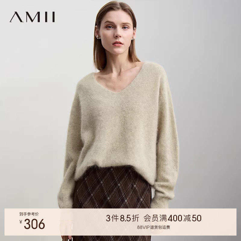 Amii2025秋新款简洁休闲V领落肩袖宽松色纺毛衣女百搭基础款上衣