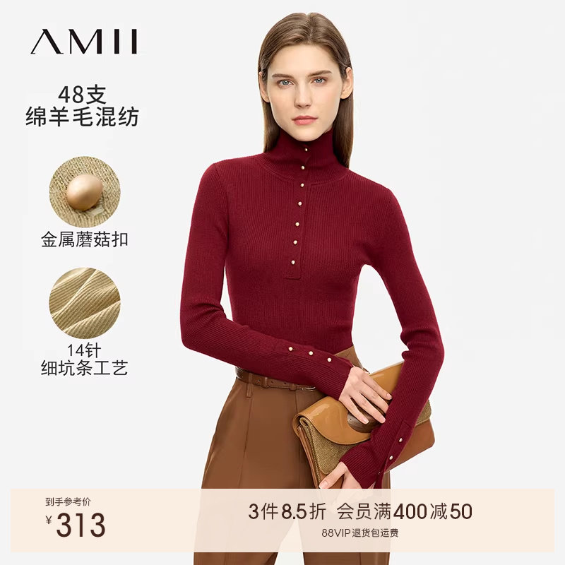 Amii2025秋新款通勤百搭排扣高领半开襟修身显瘦毛衣女细坑条上衣