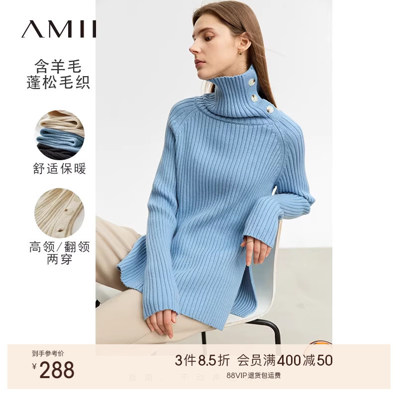 Amii2025冬新款极简中长修身高领长袖侧开衩套头百搭毛衣女