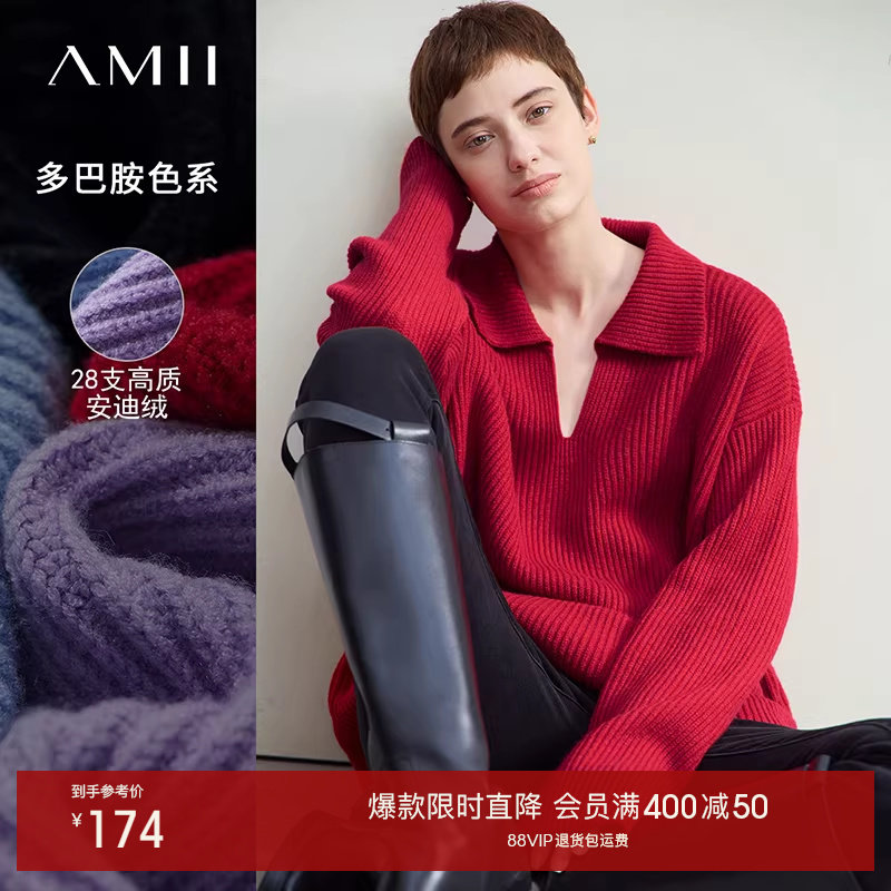 Amii法式慵懒风毛衣女2025冬新款宽松休闲小衫翻领V领落肩袖上衣