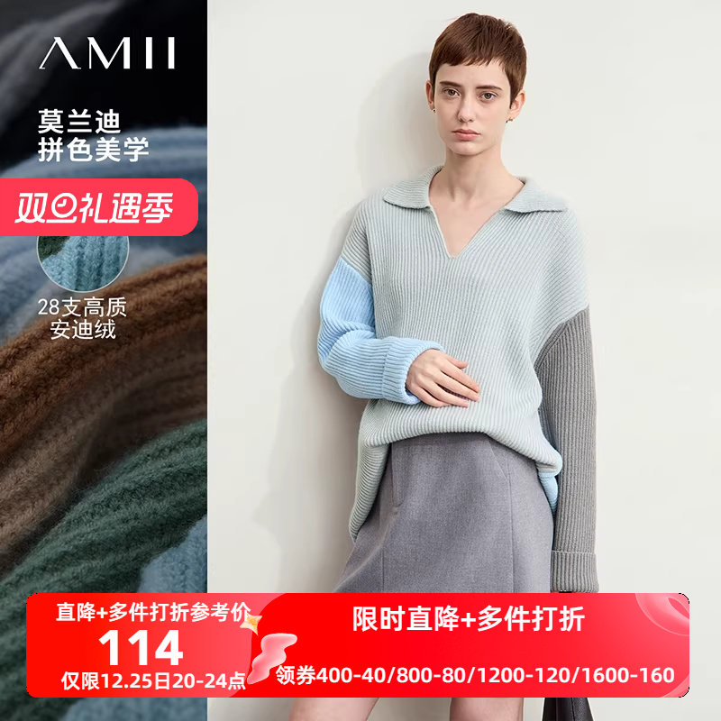 Amii2025冬新款翻领V领宽松落肩袖毛衣女撞色拼接法式慵懒感上衣