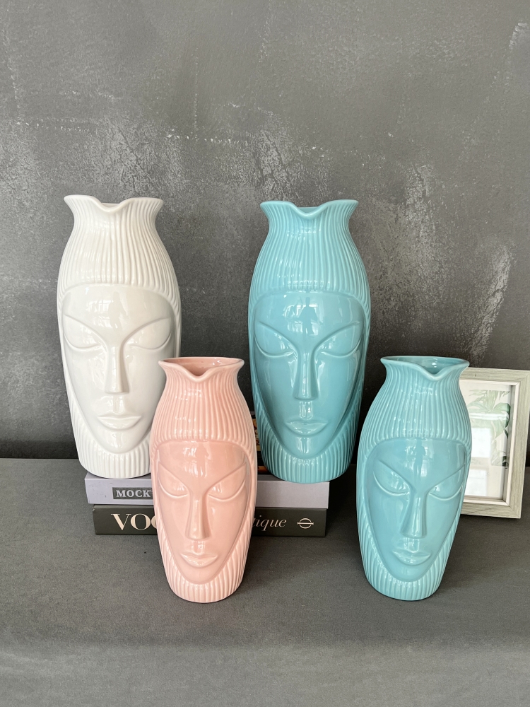 白色地中海花瓶美式竖纹脸谱陶瓷插花花瓶电视柜客厅餐桌装饰摆件