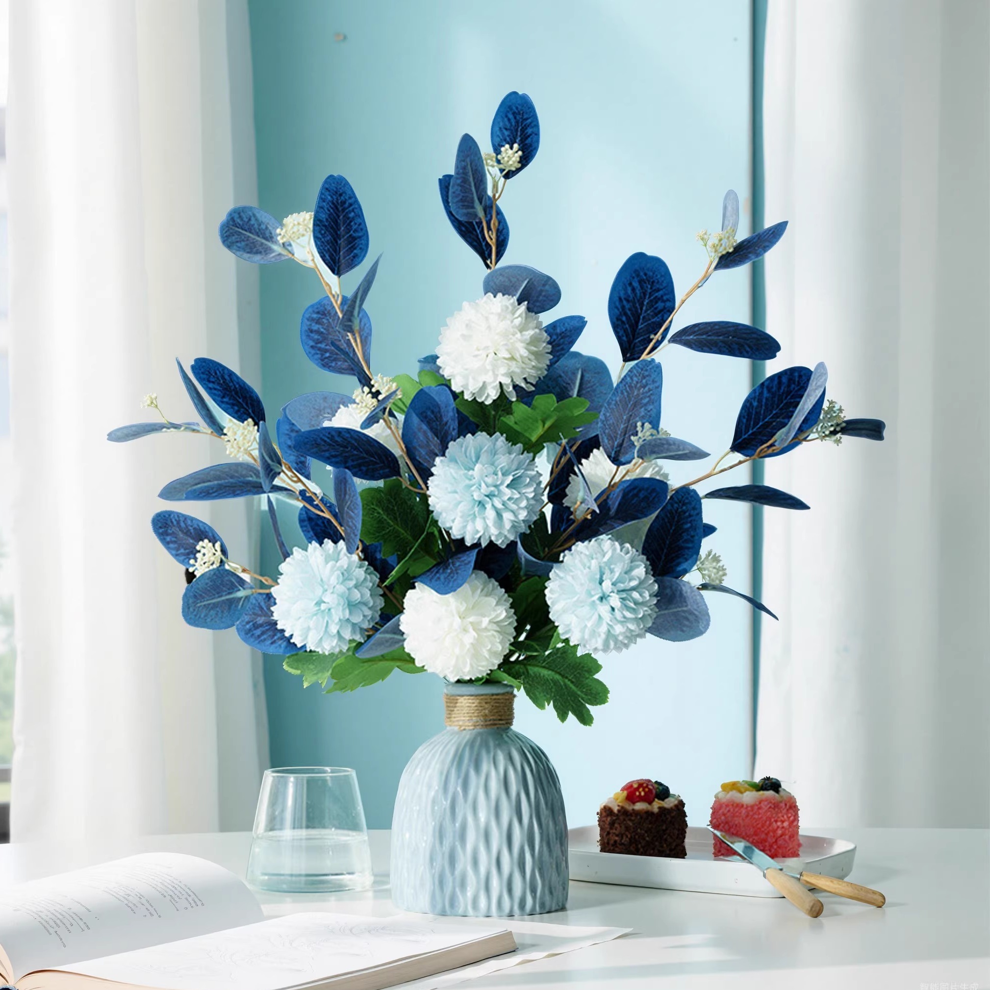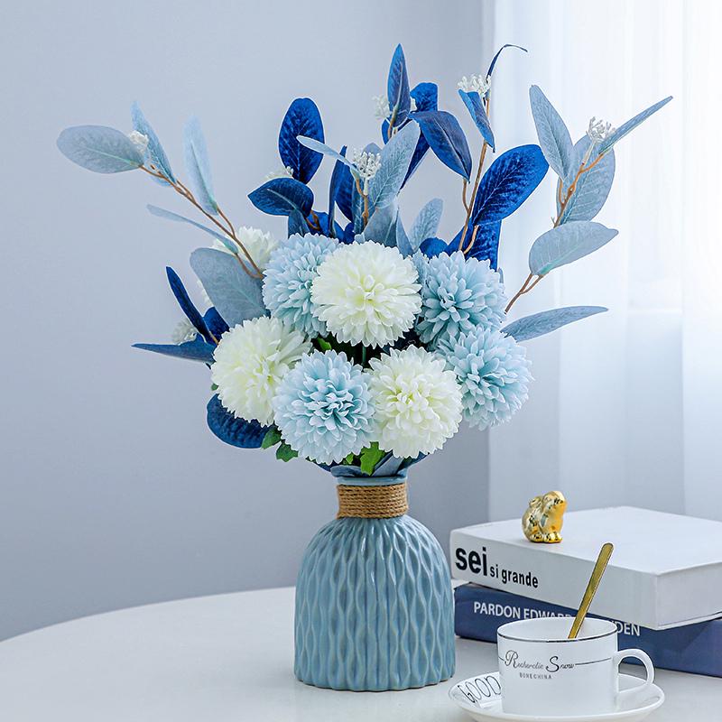 地中海简美桌面陶瓷花瓶蓝白色仿真花艺尤加利桉树叶绣球套装摆件