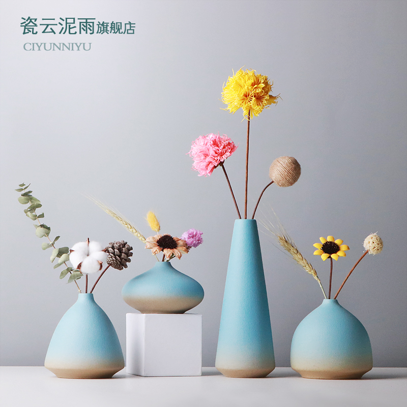 北欧蓝色小花瓶创意简约干花装饰摆件地中海家居客厅插花陶瓷摆设