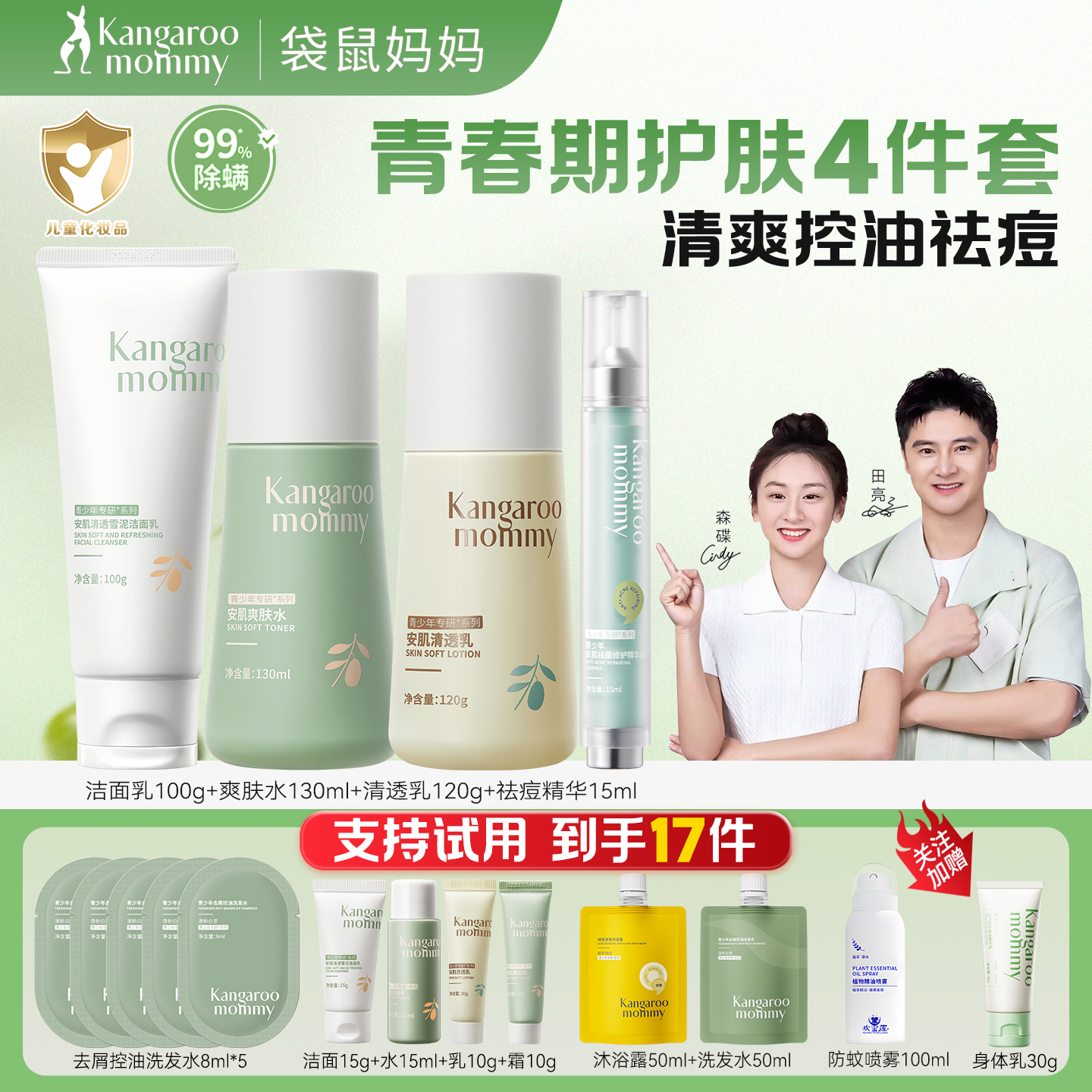 袋鼠妈妈青少年洗面奶水乳男女孩秋冬季控油祛痘防晒护肤套装正品