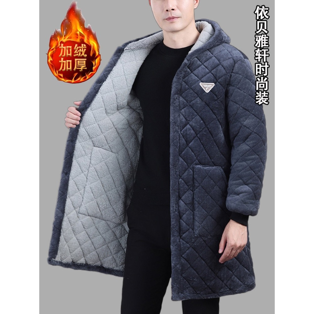 男士加绒加厚连帽棉衣中长款棉服中年男冬季保暖防寒外套宽松大褂