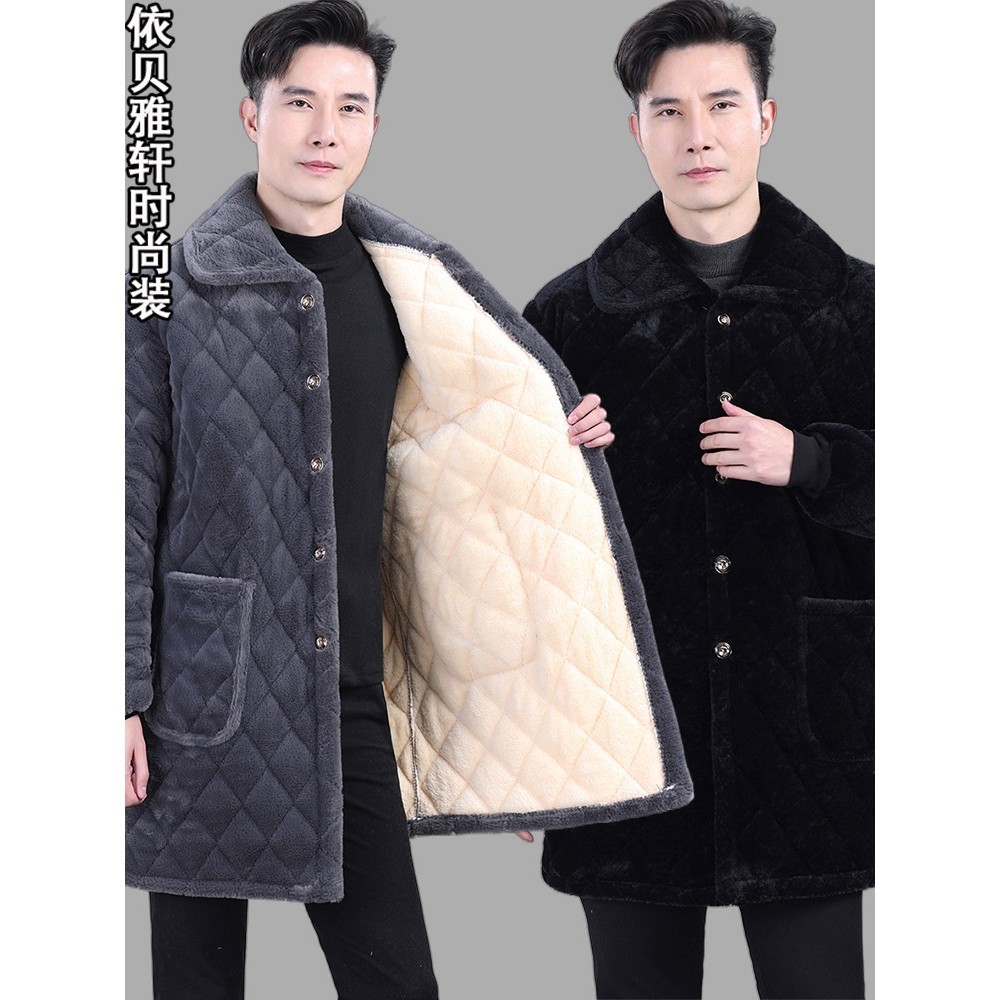 中年男冬季加厚棉衣中长款纯色翻领加绒罩衣保暖防寒宽松大褂外套