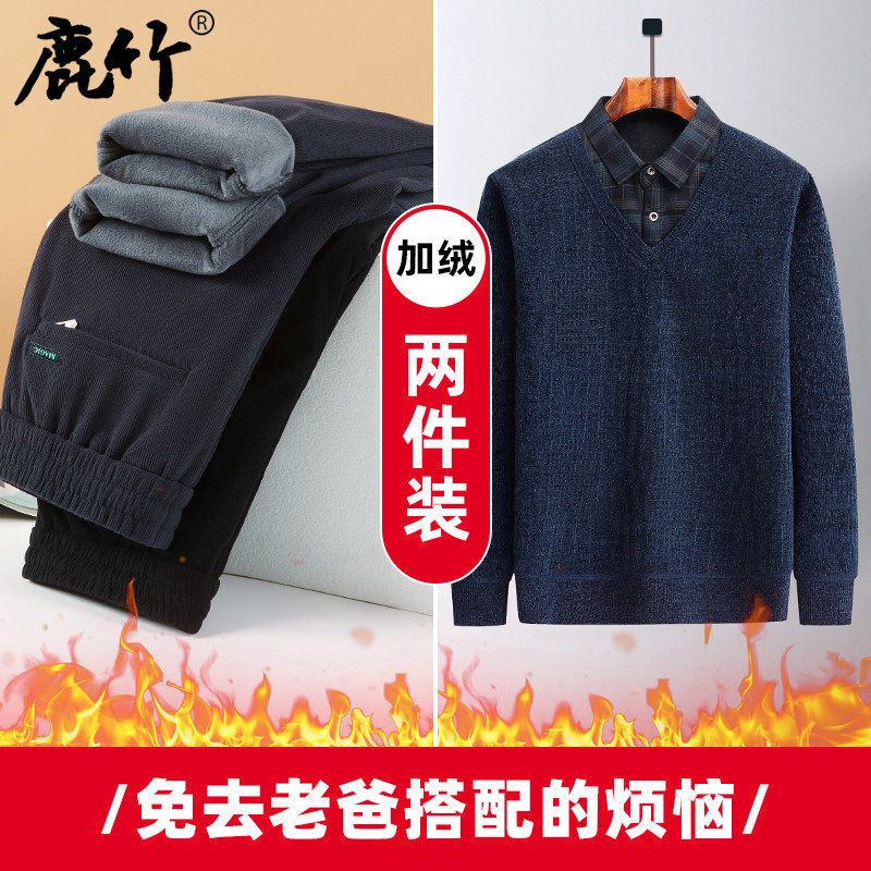 爸爸套装加绒加厚新款中年男士冬装保暖毛衣中老年男装冬季裤子男