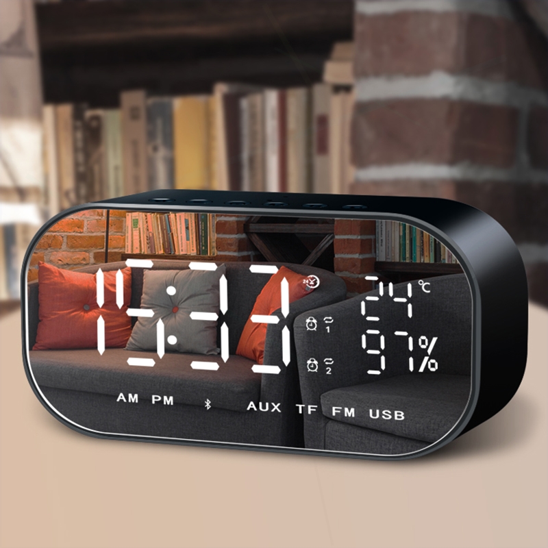无线蓝牙闹钟音箱带收音机一体小型音响可插u盘镜面家用USB低音炮