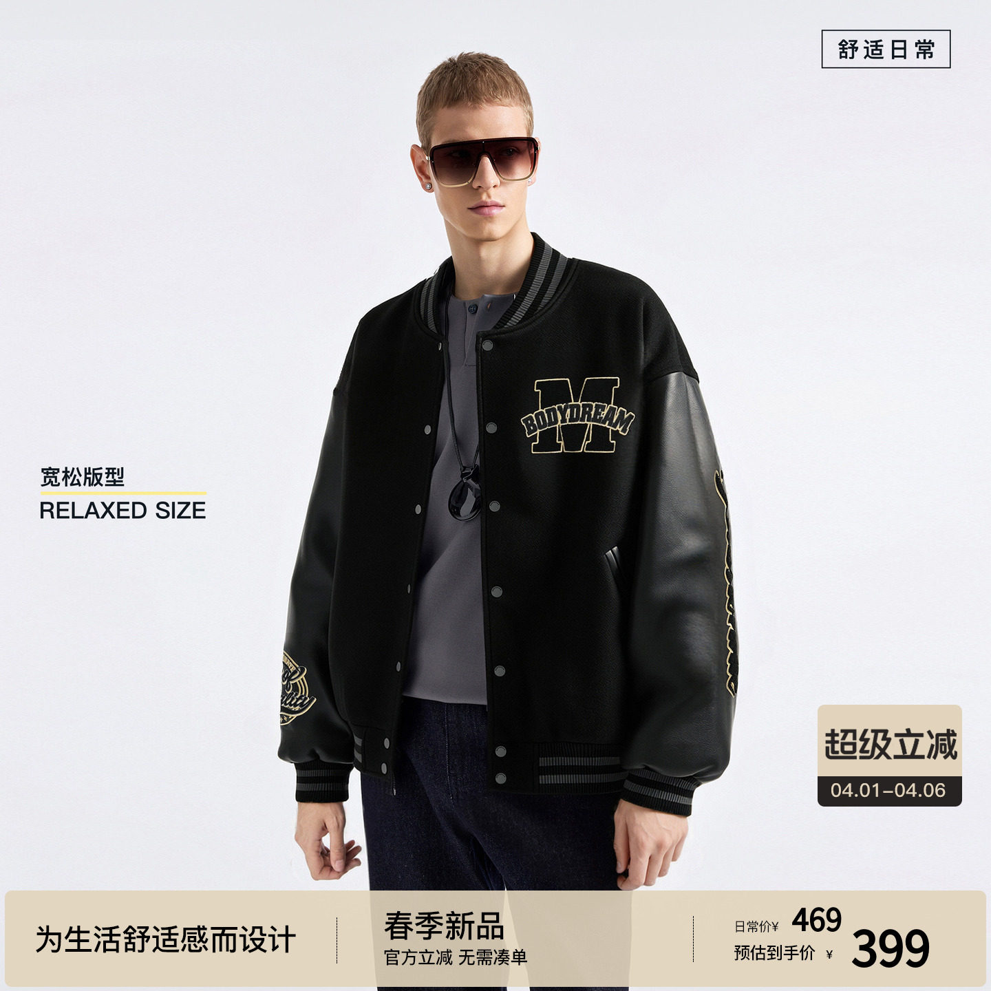 BODYDREAM重工3D立体刺绣皮革棒球服男2026春季新品毛呢外套夹克