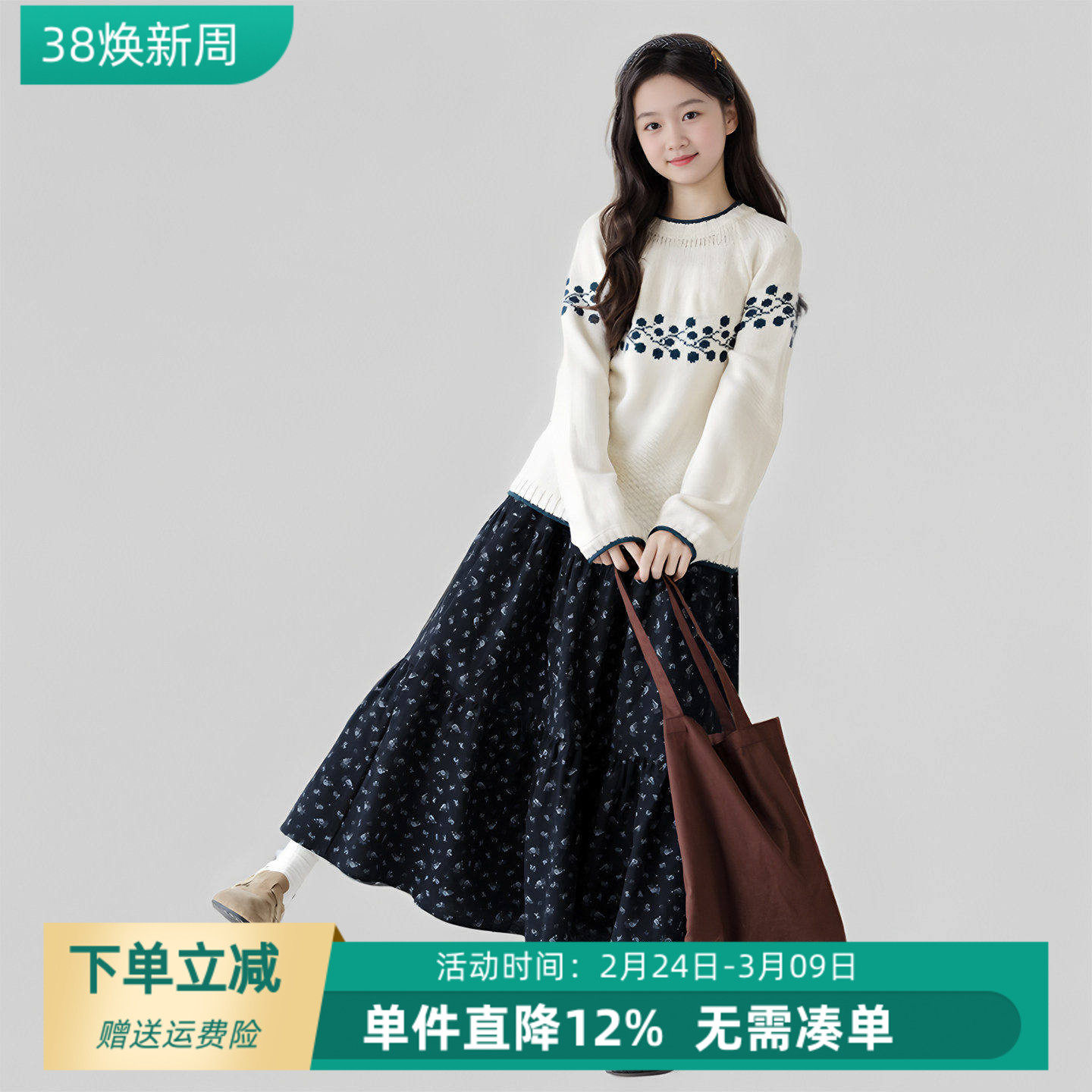 韩版女童碎花半身裙秋冬季中大童森系复古磨毛加厚长款大摆蛋糕裙