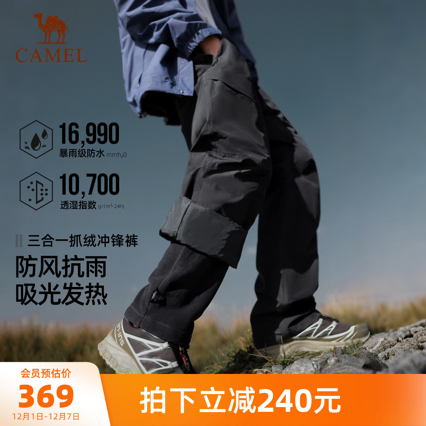 骆驼户外冲锋裤男三合一防风防水抓绒内胆高透湿防失温登山长裤女