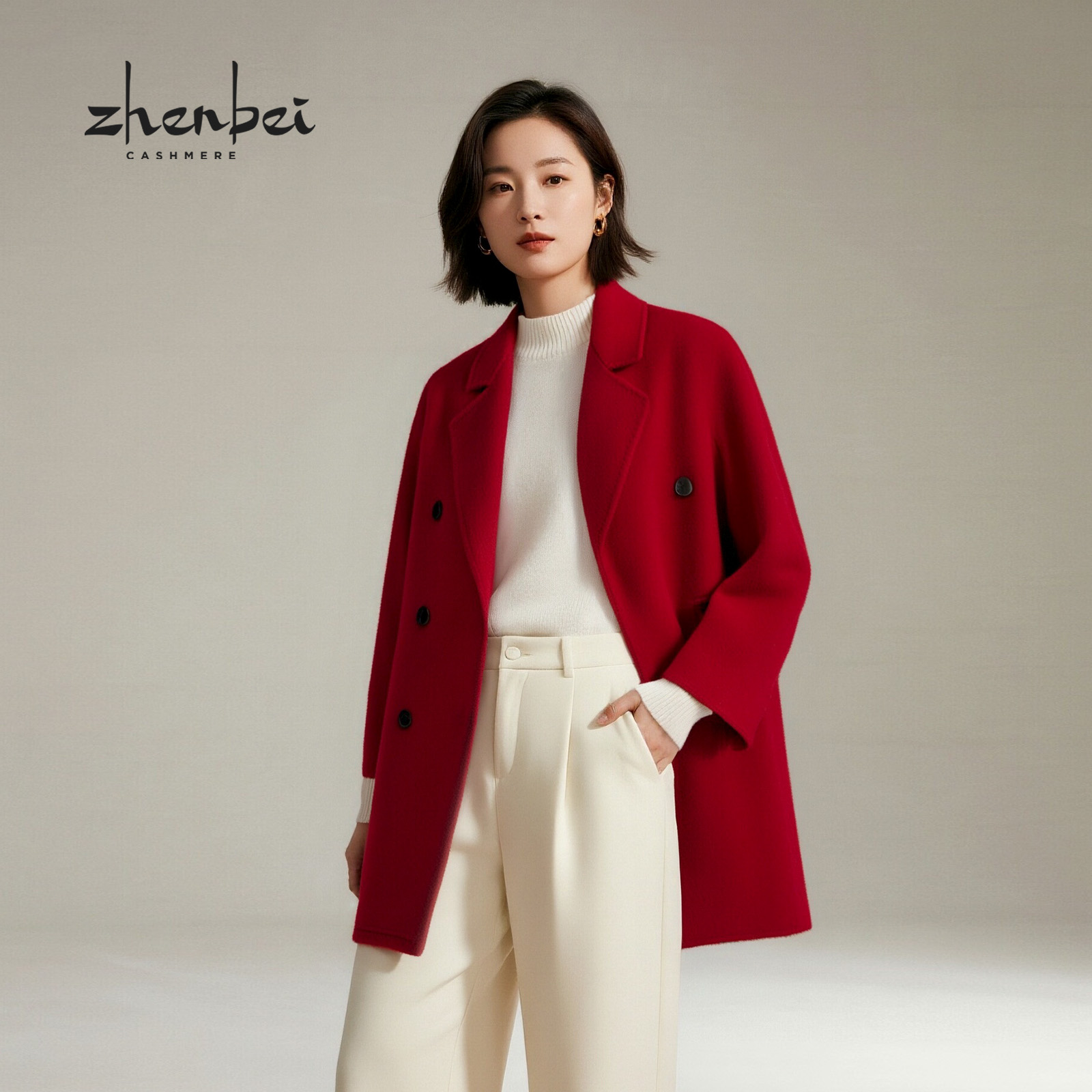 ZB/珍贝100%山羊绒红色婚宴礼大衣双面呢翻领双排扣女外套/99171
