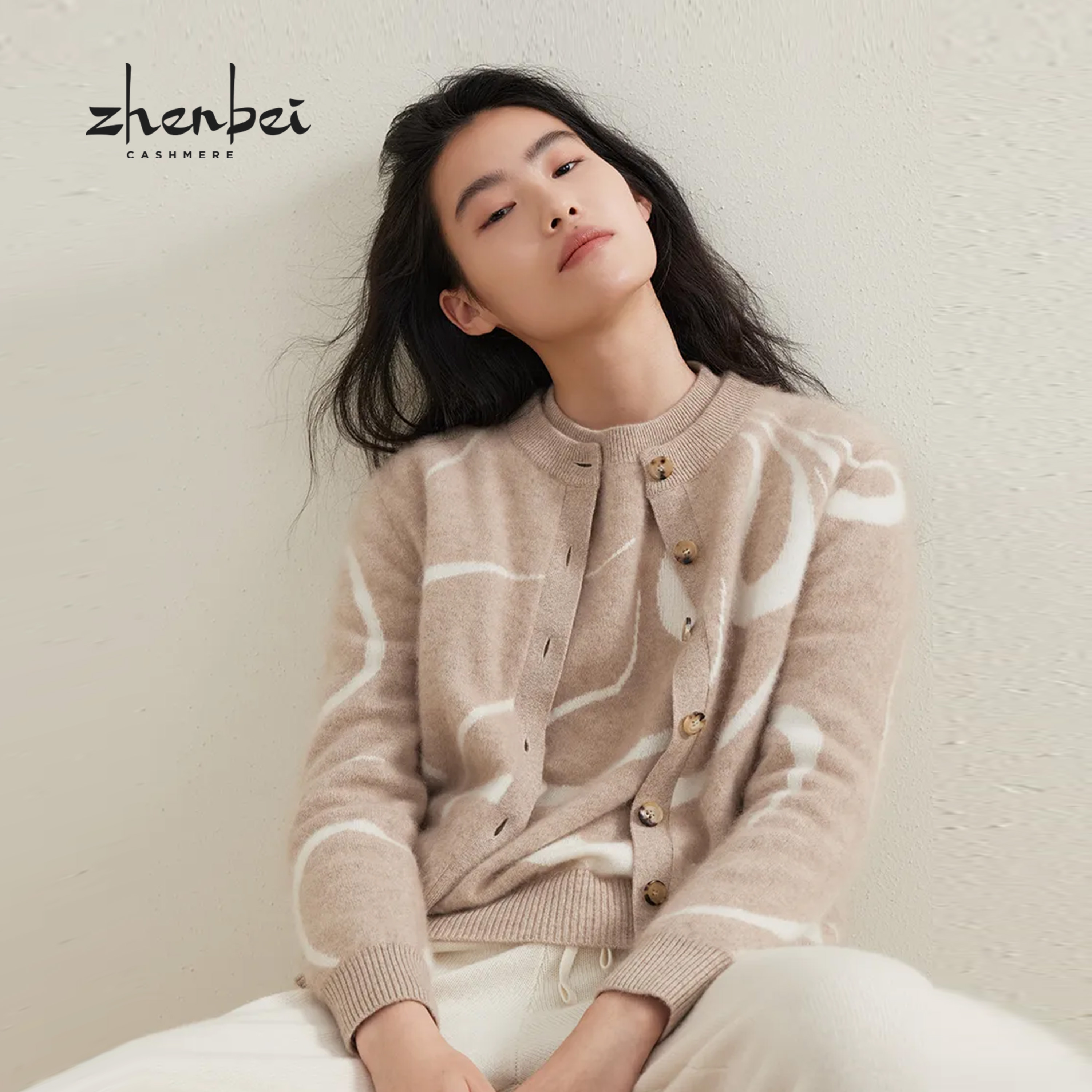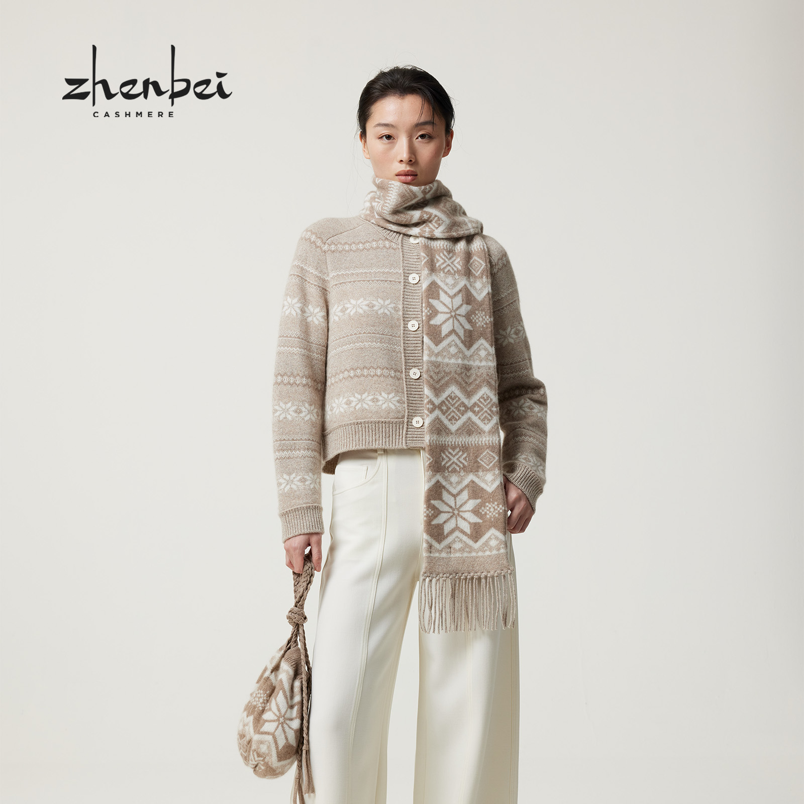 ZB/珍贝2025年秋冬新款品山羊绒100%無染色圆领提花女开衫/56573