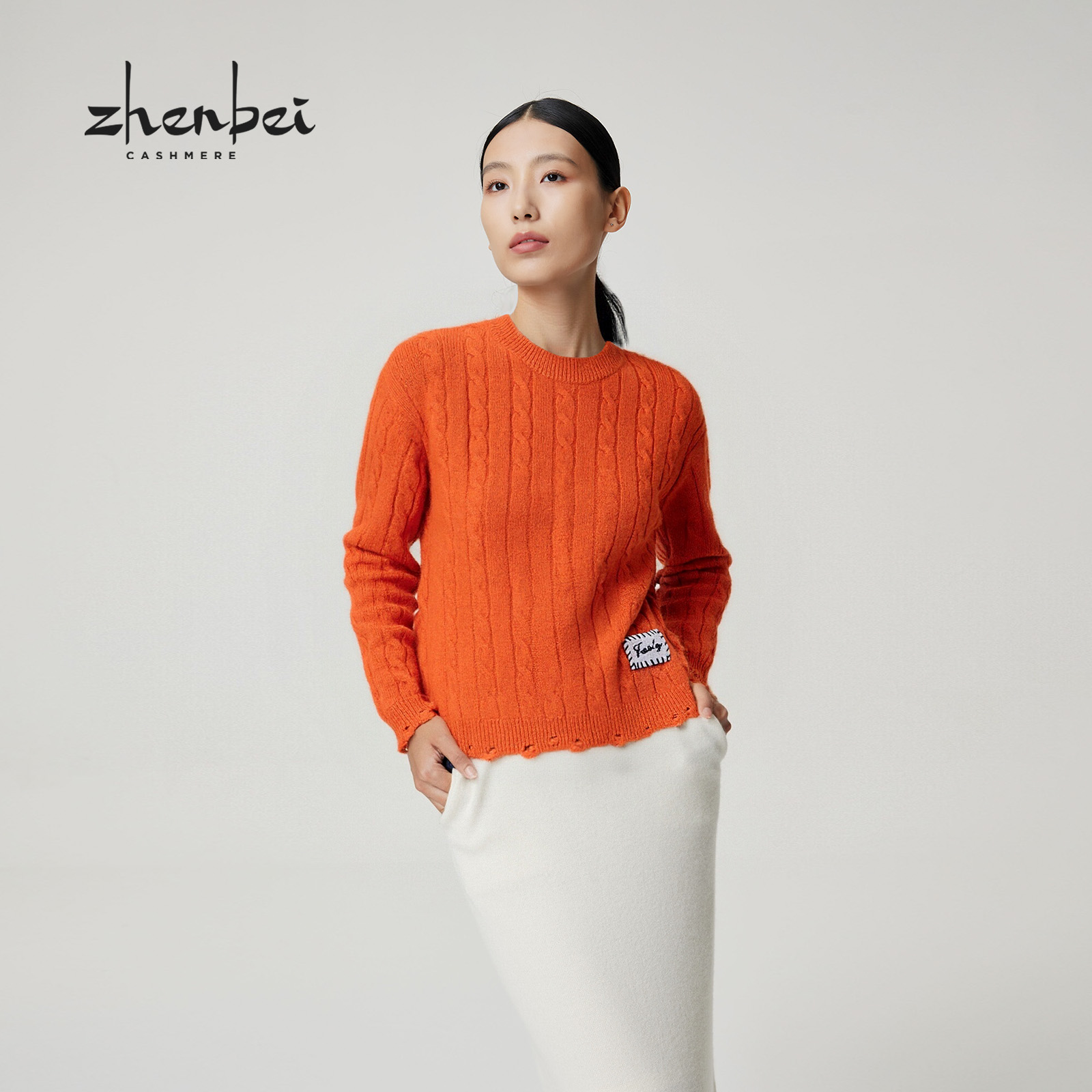 ZB/珍贝2025年秋冬新品款100%山羊绒圆领绞花绣标女衫百搭/56400