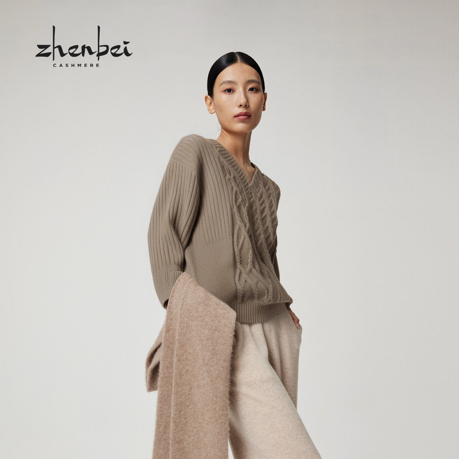 ZB/珍贝2025年秋冬新款品100%山羊绒V领绞花女开衫时尚百搭/56453