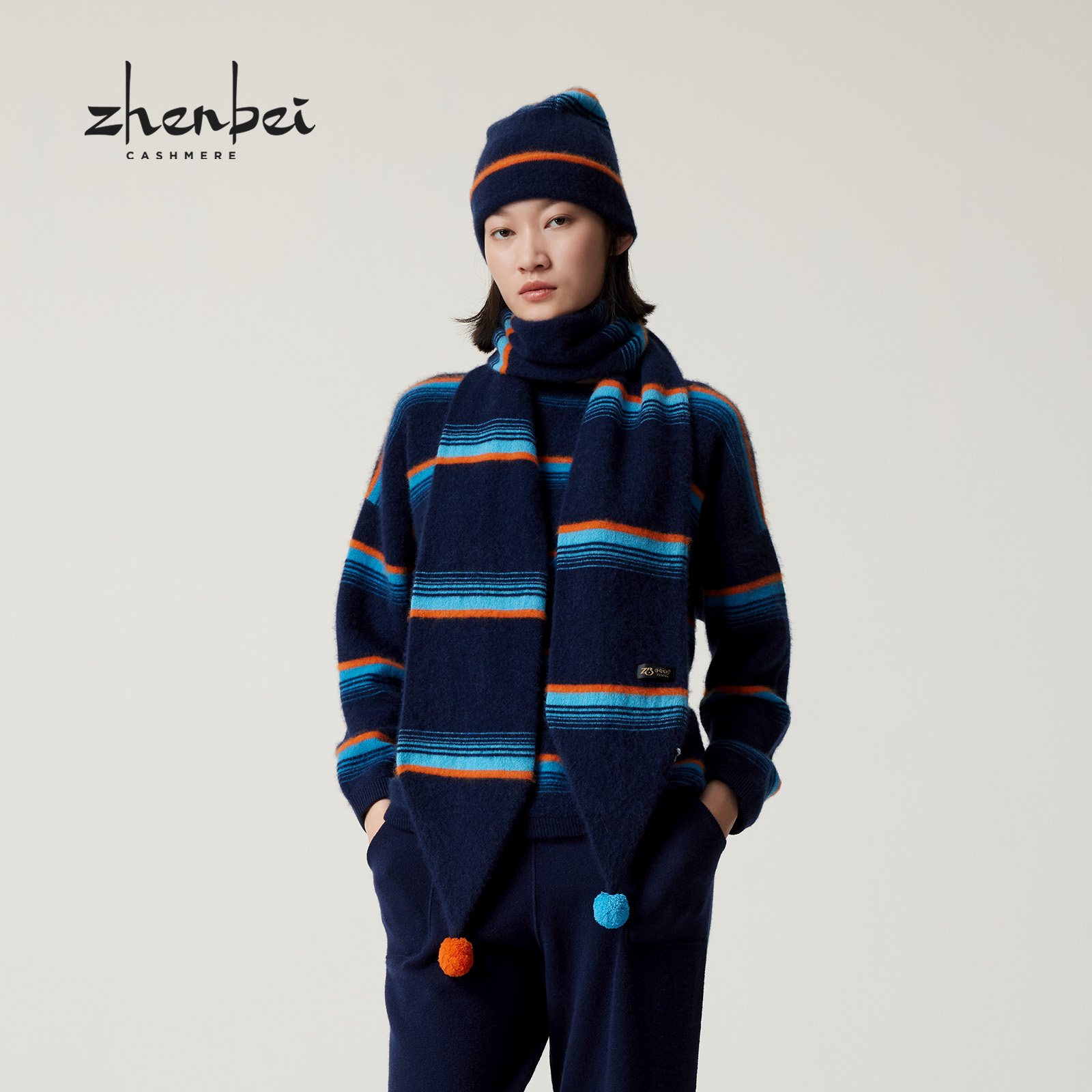 ZB/珍贝2025年新款品纯山羊绒绒绒围巾洋气时尚条纹圣诞/W2111Q