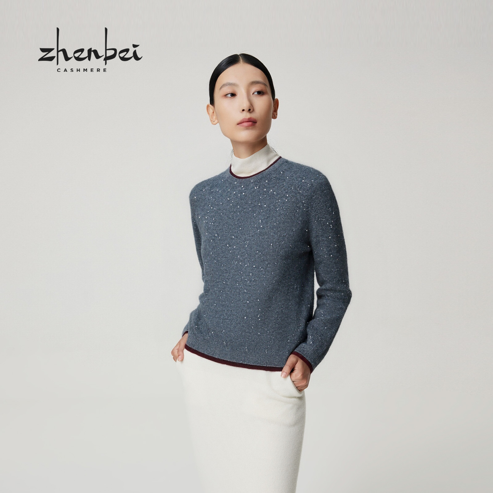 ZB/珍贝2025年新品款高支纱圆领亮片女丝绒衫时尚百搭通勤/56732
