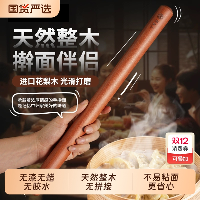 好管家红檀木擀面杖家用实木饺子皮专用大小号擀面棍擀面棒食品级