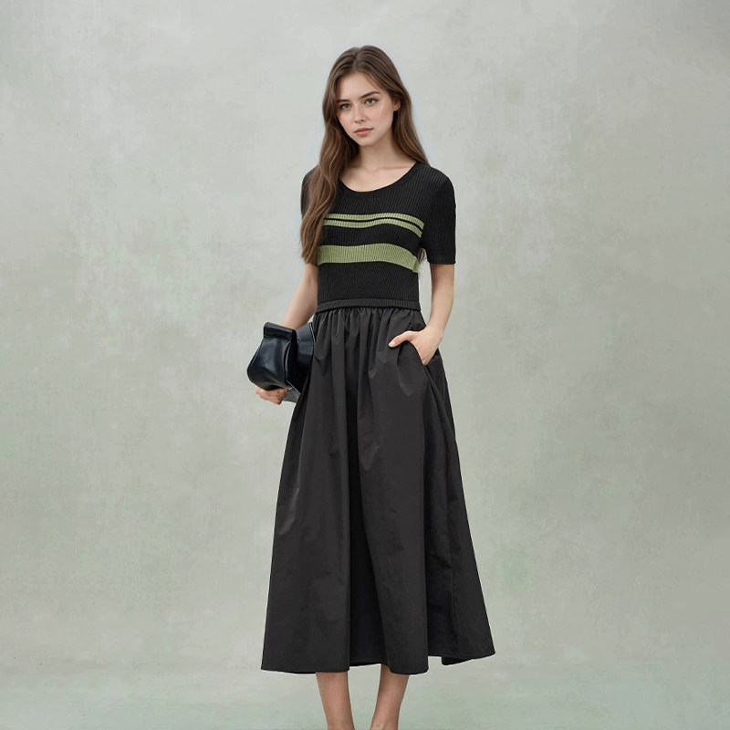 现货【商场同款】欧家同款平替 针织拼接连衣裙女短袖收腰a字长裙