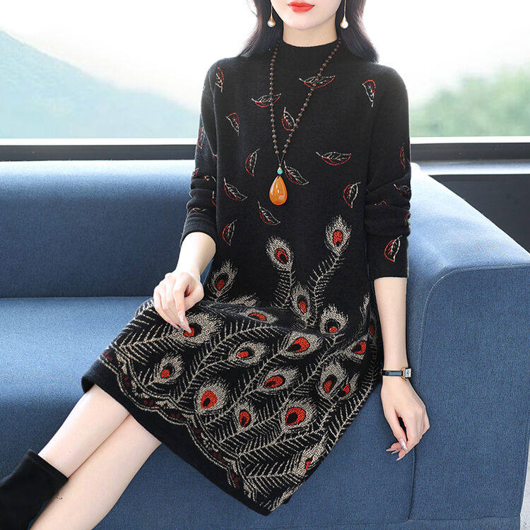 梵猫2025新款针织连衣裙孔雀花纹女中老年妈妈装大牌半高领中国风