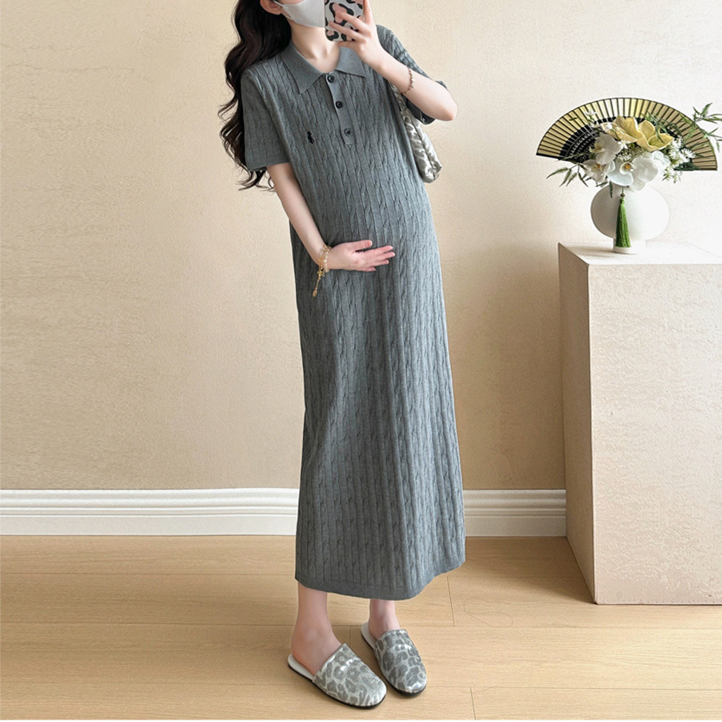 孕妇装连衣裙简约纯色polo领针织大牌感春夏新款中长款显瘦针织裙