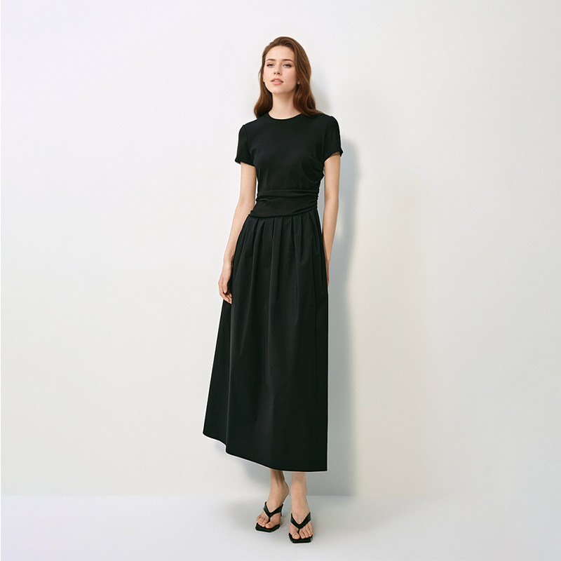 现货【商场同款】欧家同款平替 针织拼接连衣裙女褶皱收腰a字长裙