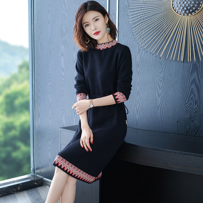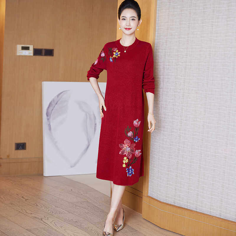 国风刺绣中长款针织连衣裙大码女装中年妈妈装大牌高档羊毛针织衫