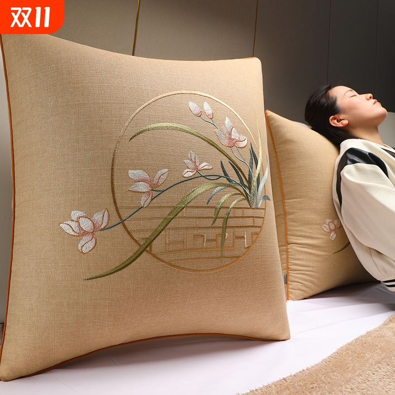 新中式古典简约素雅兰花客厅书房红木沙发抱枕靠垫棉麻混纺大靠背