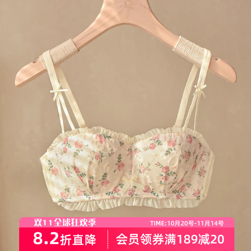 内衣女小胸聚拢显大可爱少女套装无钢圈薄款法式碎花无肩带文胸罩