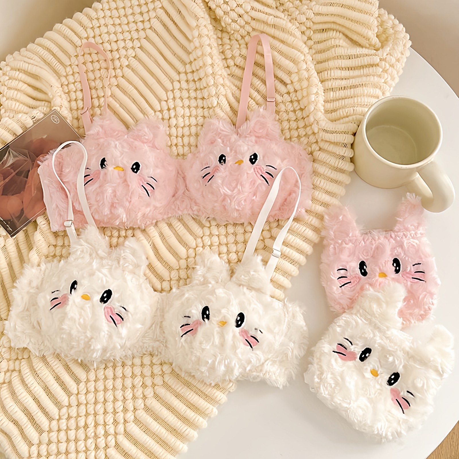 可爱卡通小猫毛绒文胸套装少女聚拢甜妹毛茸茸内衣三角裤2025冬季