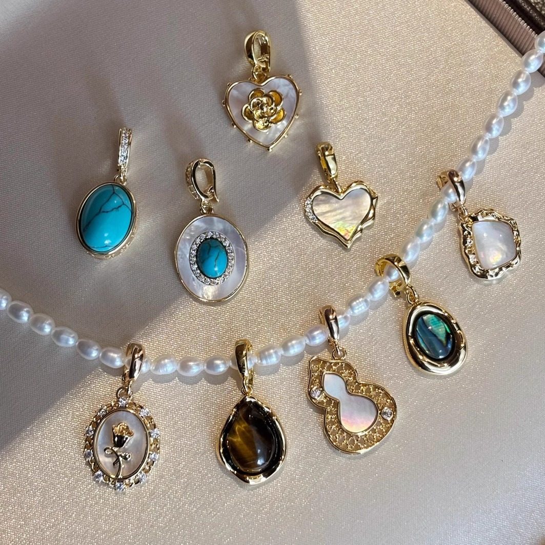 万能扣天然白贝母珍珠虎眼石玫瑰花仿绿松石单吊坠项链毛衣链挂坠