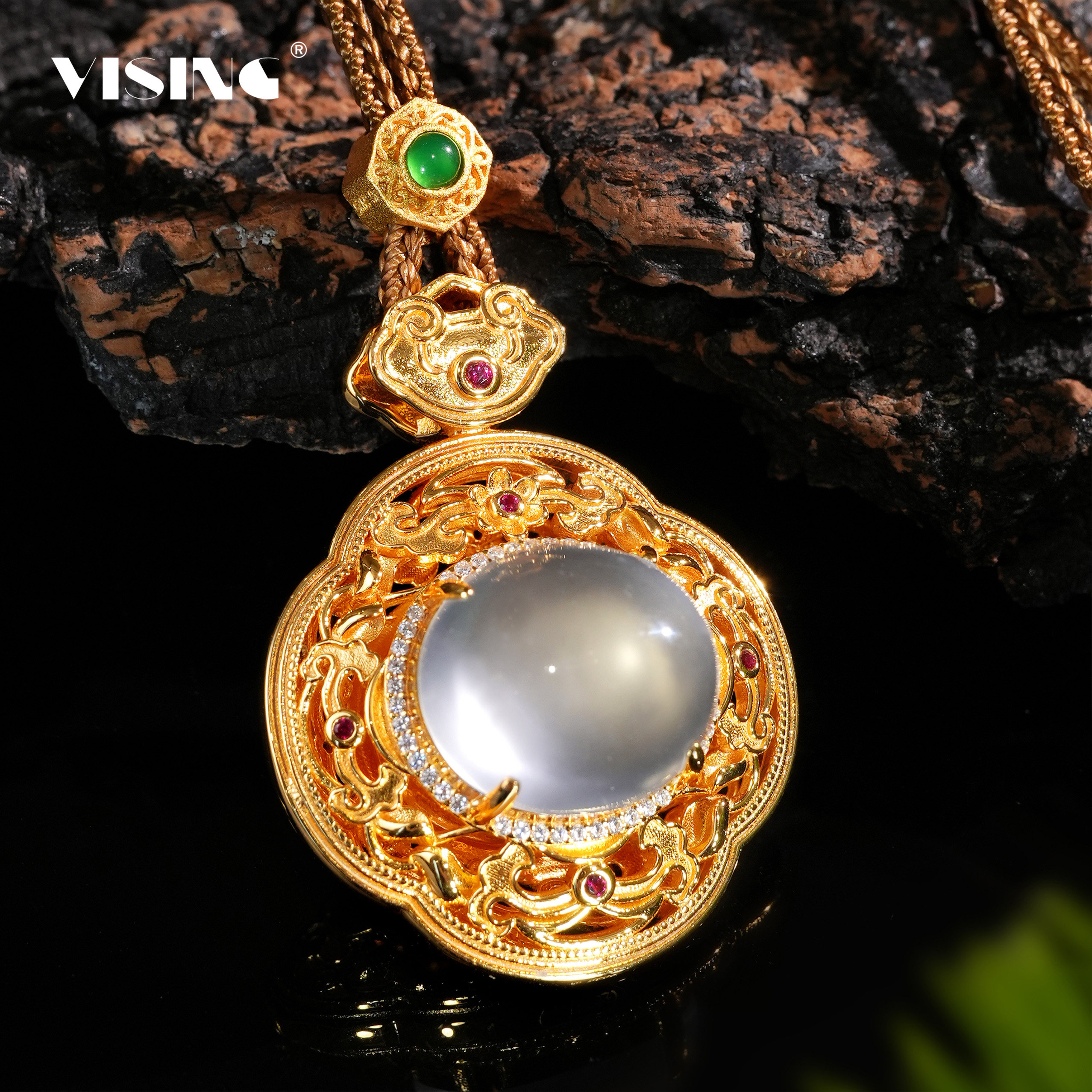 VISING天然水沫玉鸽子蛋吊坠项链毛衣链国风卷草纹设计金色S925银