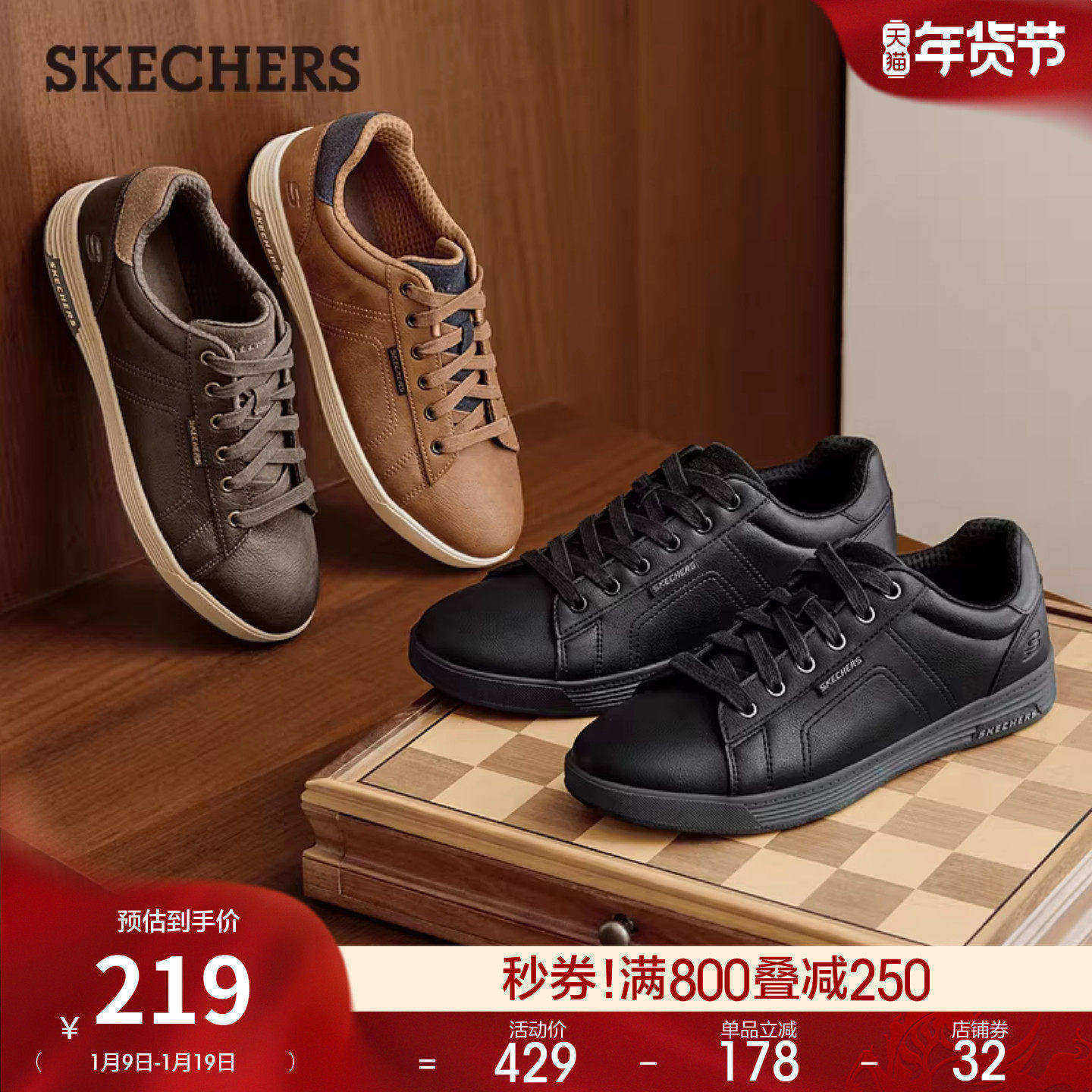 斯凯奇2025新款男鞋复古商务鞋舒适轻质运动休闲皮鞋平底板鞋